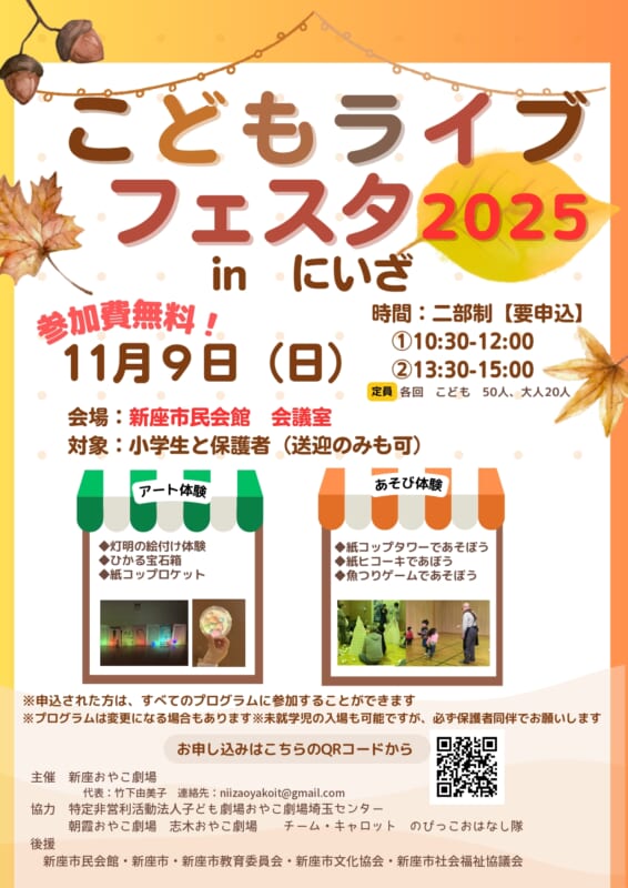 | 時間 | 二部制【要申込】 ① 10:30~12:00 ② 13:30~15:00 〈定員〉 各回 こども 50人、大人 20人 ※未就学児の入場も可能ですが、必ず保護者同伴 |